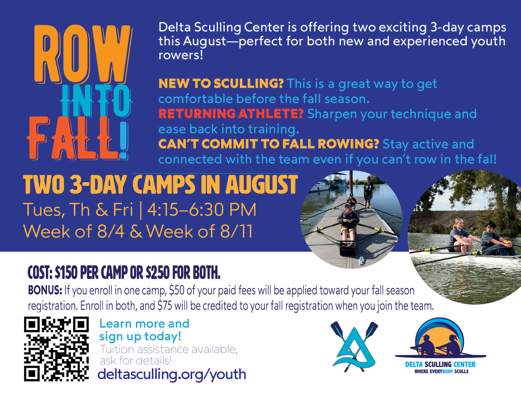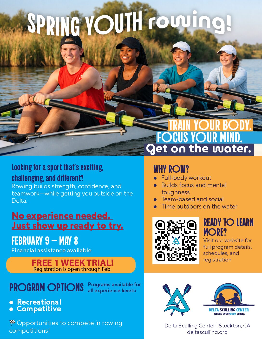 Join Coach Jessica Andersen and the DSC coaching staff for recreational and competitive programs tailored for 6th to 12th-grade youth. Engage in practices after-school and weekends, and camps during the off-season. Experience fitness training on land and sculling on the water in single, double, and quad (4-person) boats. Compete in virtual and live indoor rowing championships, and compete in regattas that incentivize hard work and goal setting. We provide all the gear and equipment; just bring a good attitude and be ready to experience the awesome sport of rowing!